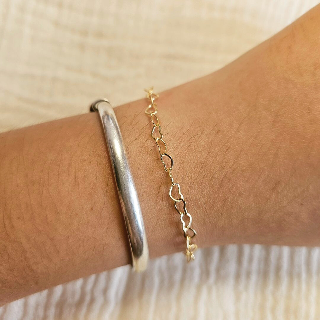 Esta pulsera presenta un diseño delicado de corazones dorados, que rodean tu muñeca e irradian un brillo cálido y radiante. Perfecto como complemento para cualquier set o conjunto de pulseras en donde su sutileza resalta a otras piezas de joyería.